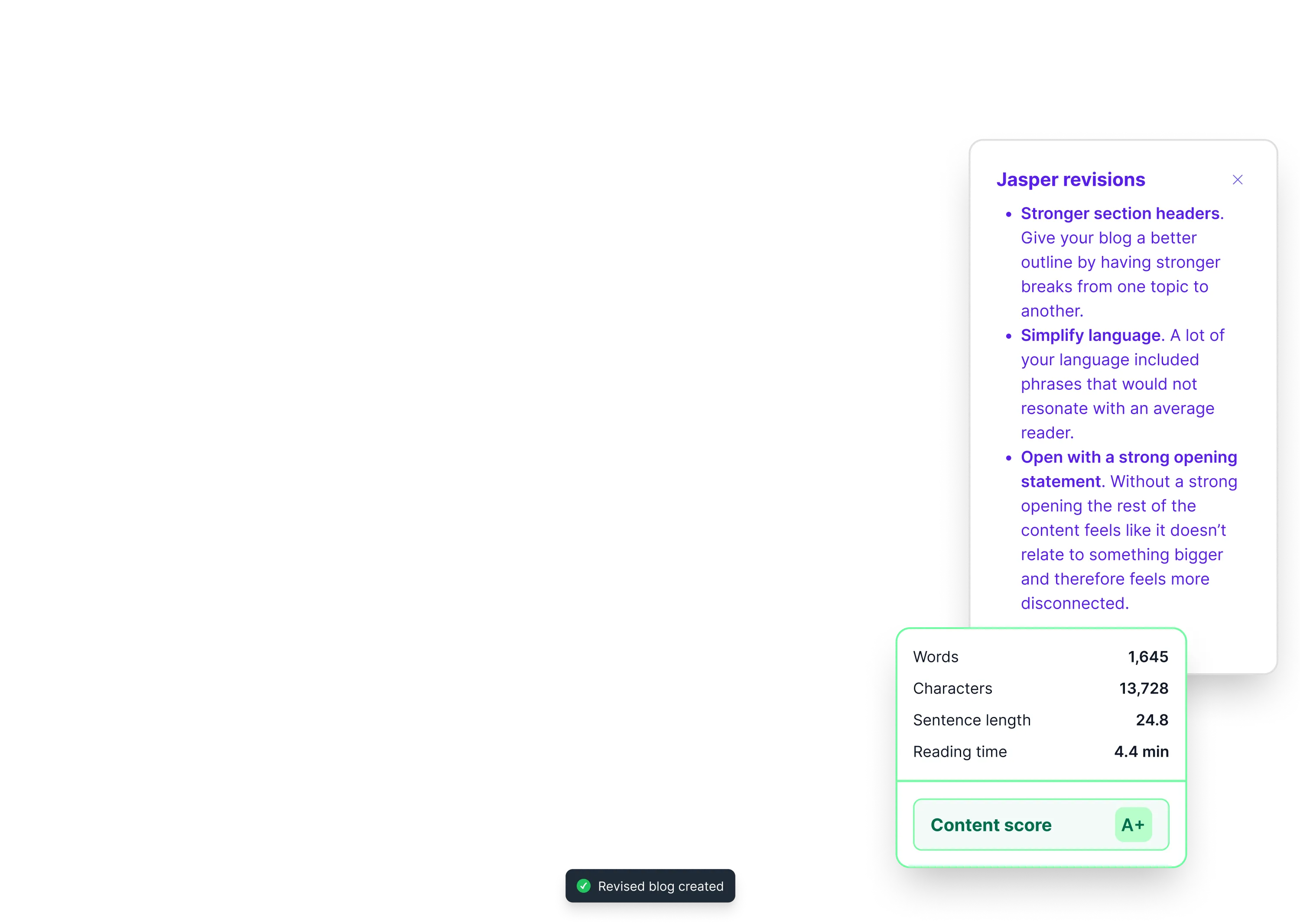 AI isn’t next, it’s now. Harness it with Jasper to transform your creative capability, better connect with your customers, and secure your competitive advantage.