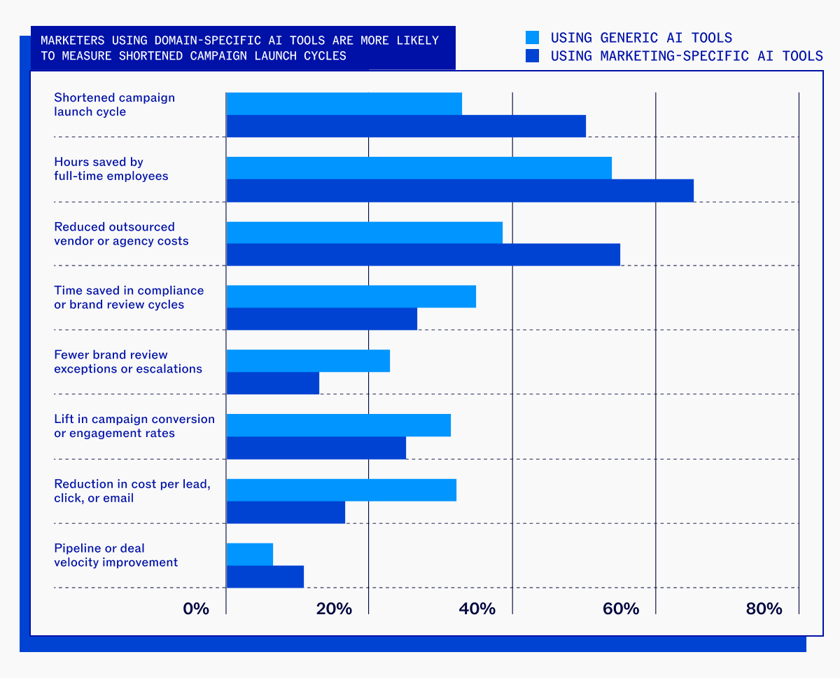 Organizations that use marketing-specific tools are 1.5x more likely to bring their campaigns to market in weeks or days than those relying on generic AI tools. They’re also more likely to measure shortened campaign launch cycles, cited by 49% of domain-specific tool users vs. 34% of those using generic tools.