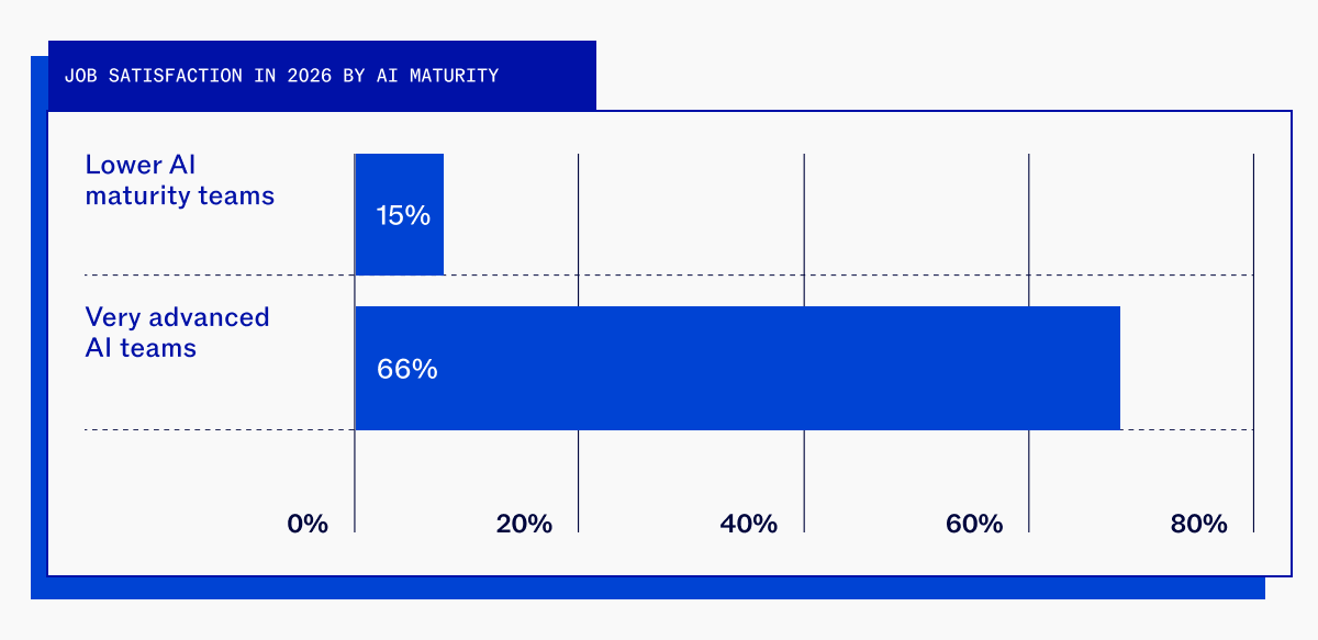 At the same time, their teams become more productive and happier in their roles—66% of high-maturity organizations report increased job satisfaction from their roles compared to just 15% in beginner organizations. When teams experience AI as an embedded part of the way they work with clear guidelines, they embrace it more readily and use it with confidence.