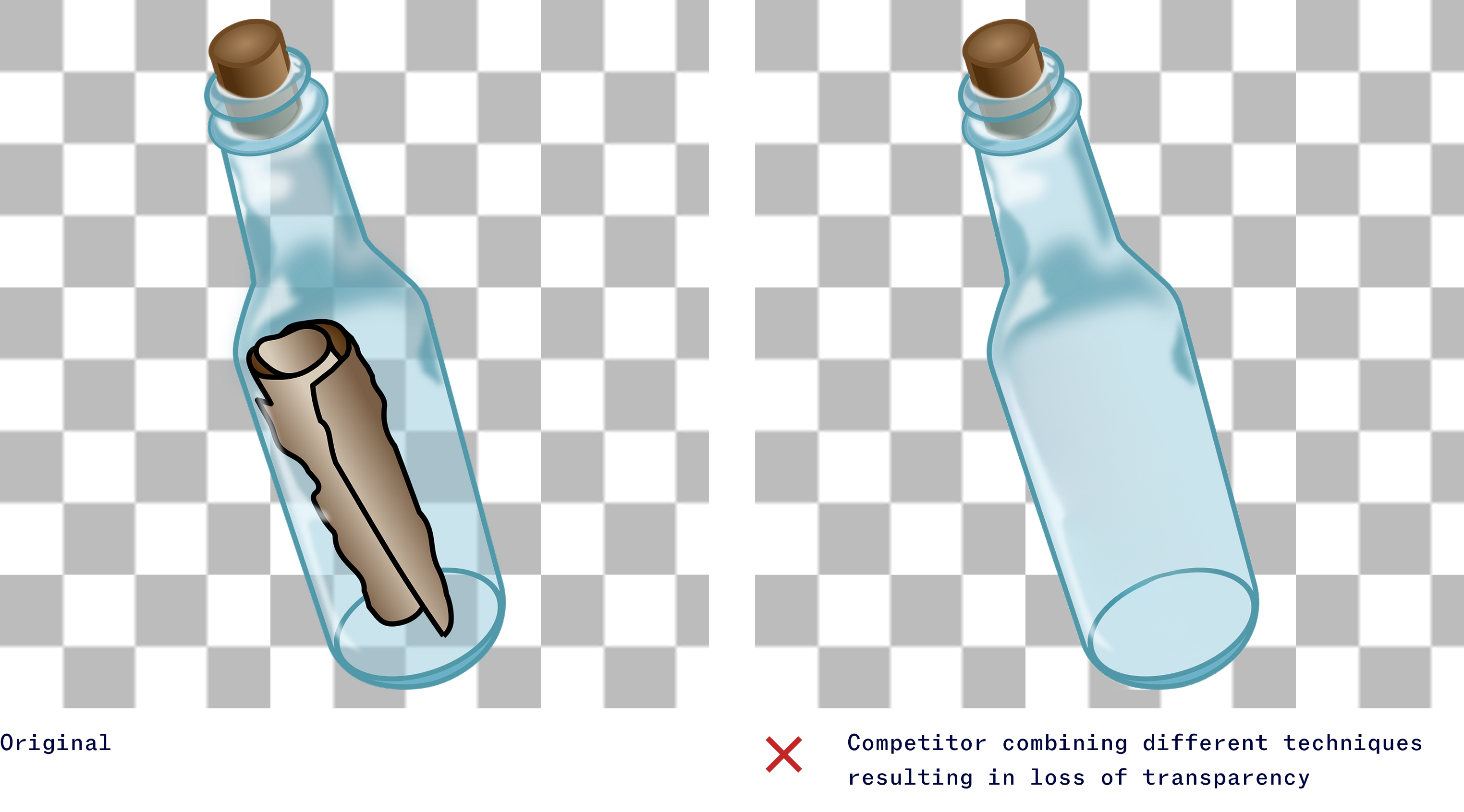 Some other solutions struggle with RGBA images, returning RGB output with discolored and distorted object rendering. See the example below: