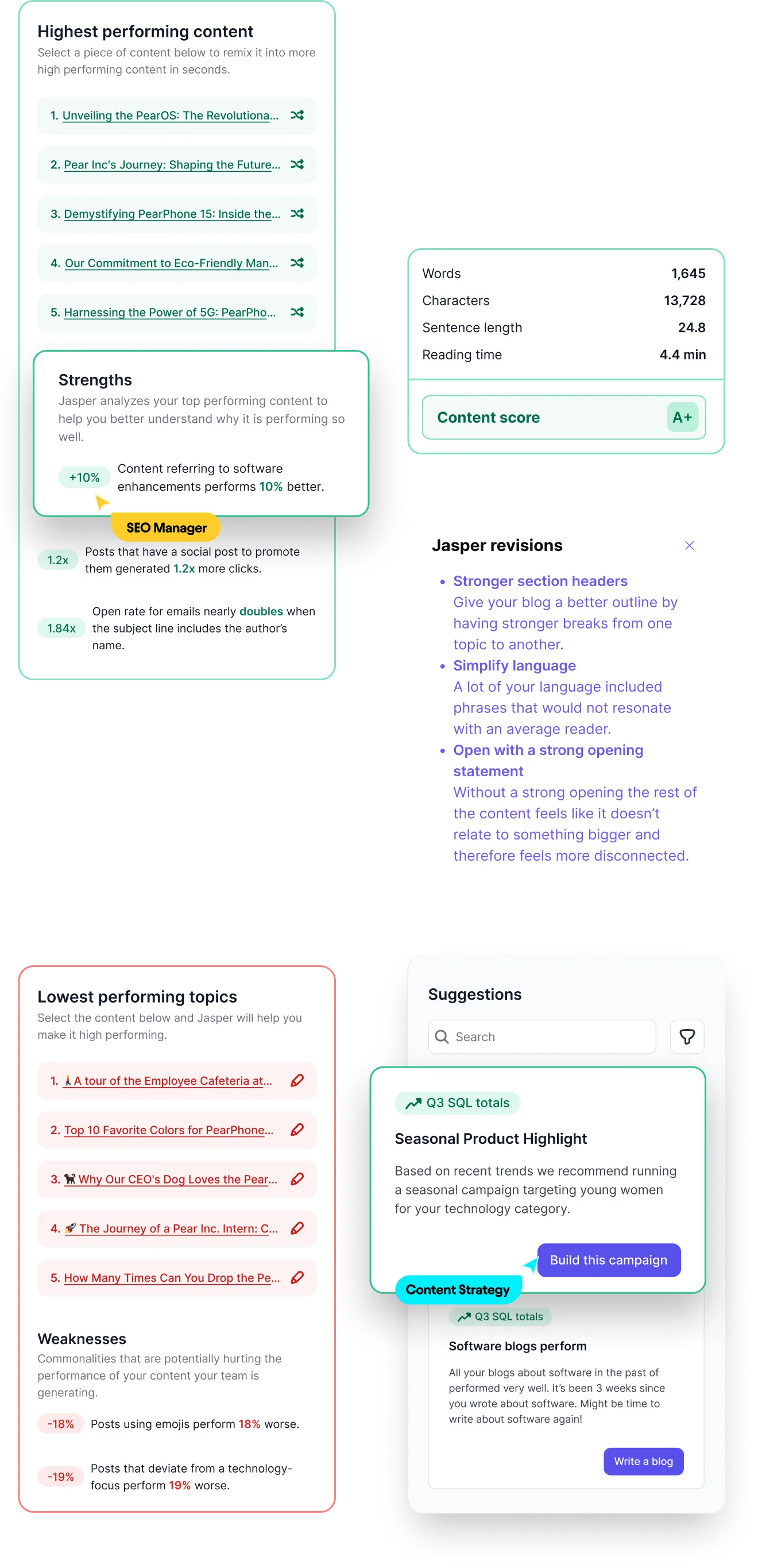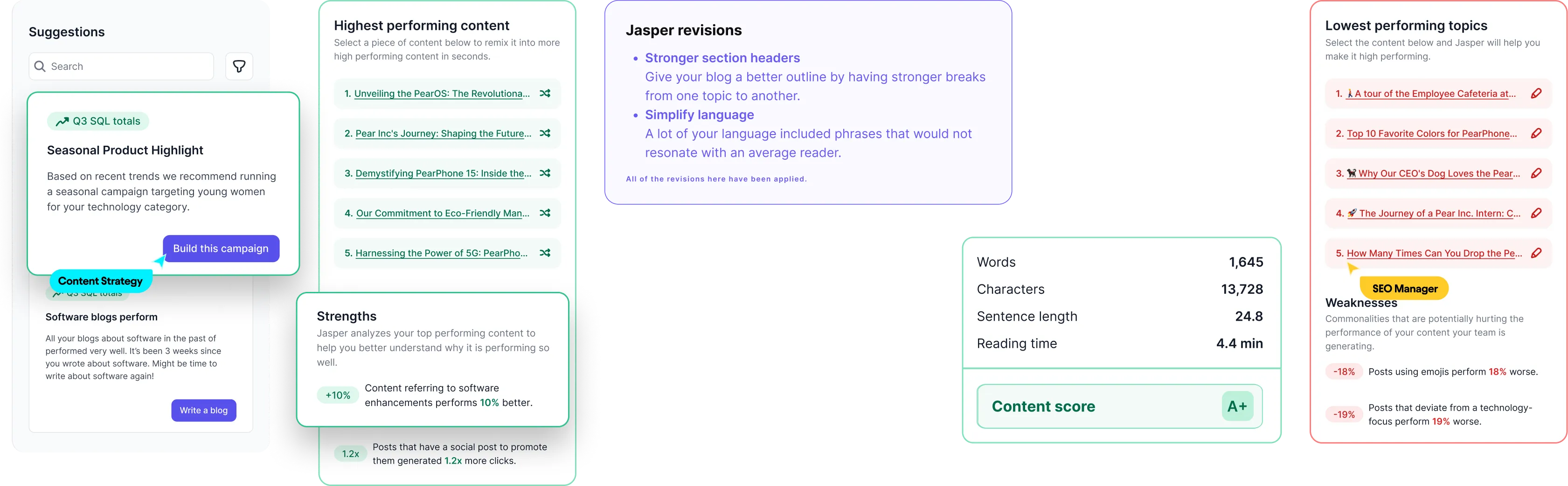 Jasper will make recommendations based on your data to improve low-performing content.